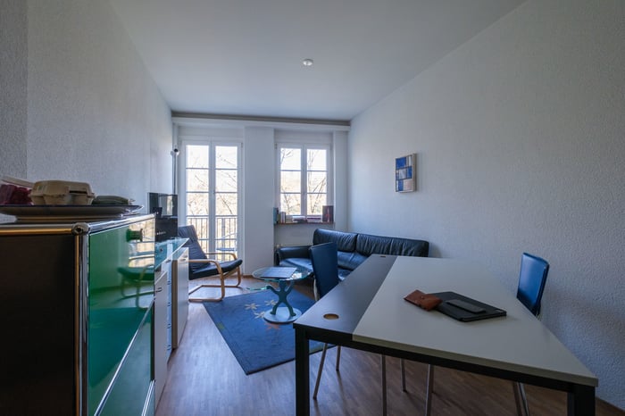 Ein Wohnhaus hoch über der Aare in der Berner Altstadt mit Sicht auf die Aare und Sicht auf die Altstadt.
